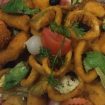 Pichanga de mariscos con base de papas fritas naturales, tomate, palta, queso, huevos, aceitunas, pickles, anillos de calamar salmón y camarones fritos en panko